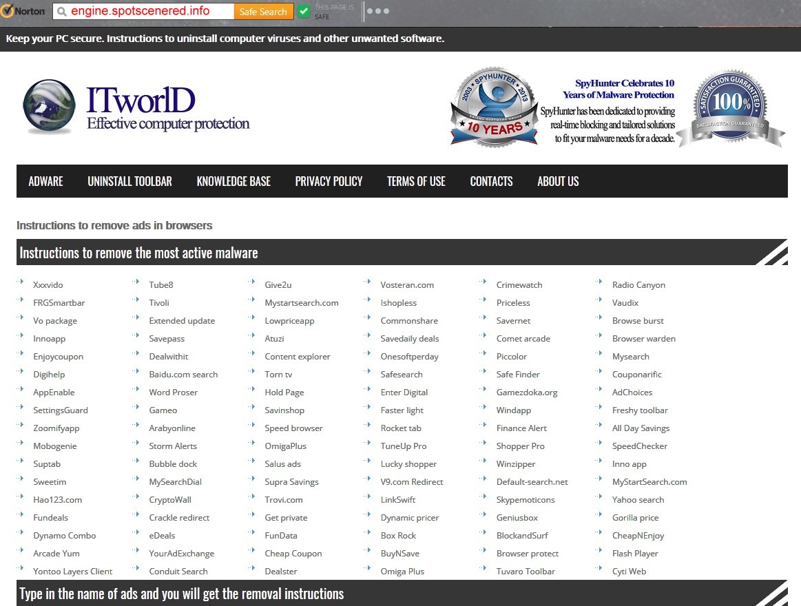 To research this malicious ware, I turn to Norton Safe Search keywords "engine.spotscenered.info" providing several found results and this link http://itworldguide.com/ as shown below in finding "ways-to-remove-engine-spotscenered-info-ads" 2nd image