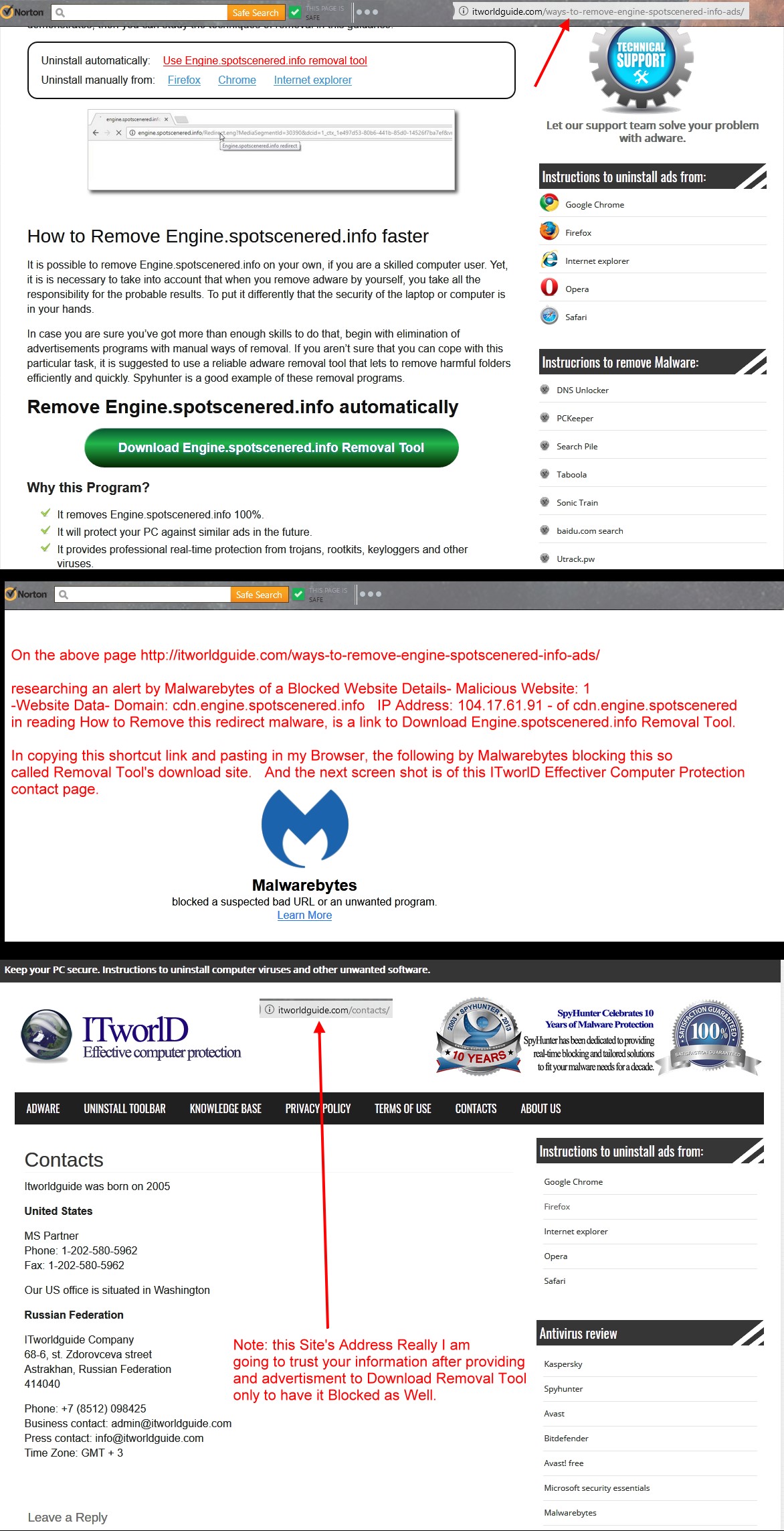 To research this malicious ware, I turn to Norton Safe Search keywords "engine.spotscenered.info" providing several found results and this link http://itworldguide.com/ as shown below in finding "ways-to-remove-engine-spotscenered-info-ads" 2nd image